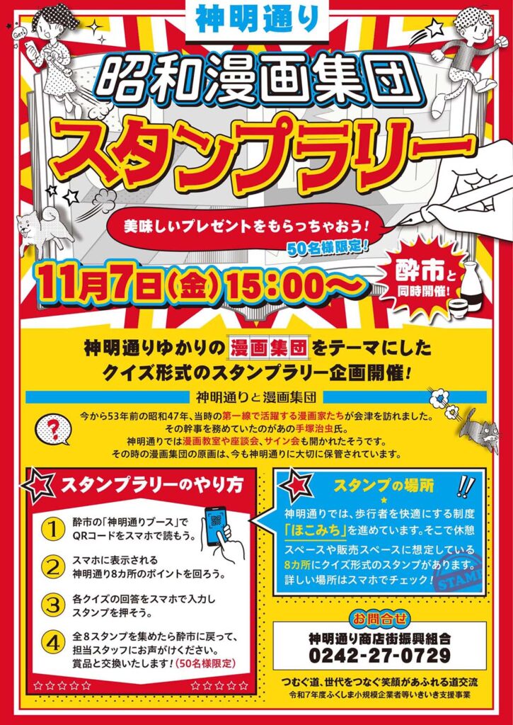 神明通り商店街で開催される、“漫画集団スタンプラリー”を告知するポスターです。