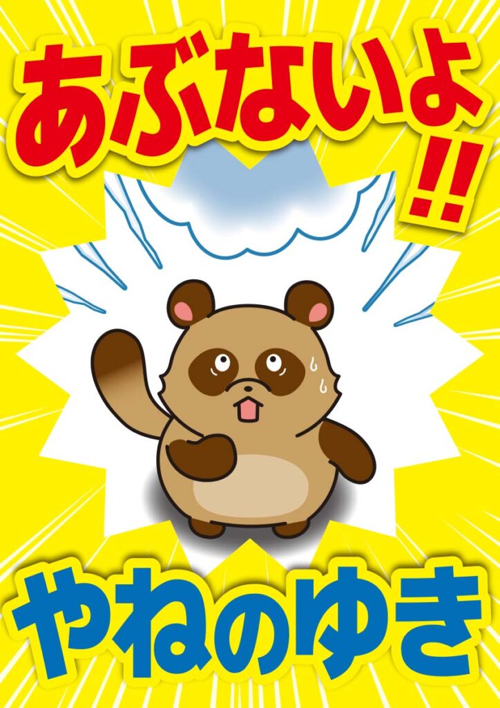 サイズが小さいのでできるだけ目立つ色を使い、文字も大きくしてシンプルにデザインしました。また、かわいくしてほしいというご希望もあったので、タヌキを描きました。そのタヌキが屋根の雪を怖がる構図とひらがなの使用で、小さい子でも誰でも分かりやすくしました。